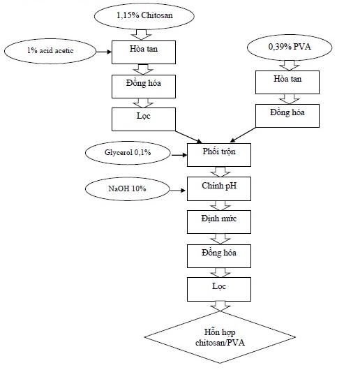 PVA (200g) được hòa tan trong 9L nước, khuấy đều và đồng hóa bằng máy IKA 18 tốc độ khuấy 4.000 vòng/phút trong 15 phút. Phối trộn dung dịch chitosan và PVA đã chuẩn bị trước đó, bổ sung thêm vào hỗn hợp 20g glycerol, khuấy đều, chỉnh pH hỗn hợp về 5,5 bằng NaOH 10%, bổ sung thêm acid acetic loãng (1%) đến thể tích 20L, tiếp tục đồng hóa bằng máy IKA 18 tốc độ khuấy 4.000 vòng/phút trong 15 phút, sau đó lọc hỗn hợp qua lưới lọc có kích thước 100 mesh, thu được hỗn hợp chứa 1,15% chitosan, 0,39% PVA (w/v)..