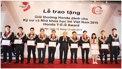 Bộ trưởng Bộ Khoa học và Công nghệ Nguyễn Quân và đại diện Honda Việt Nam trao giải cho các gương mặt xuất sắc 2015. Ảnh Nam Nguyễn.